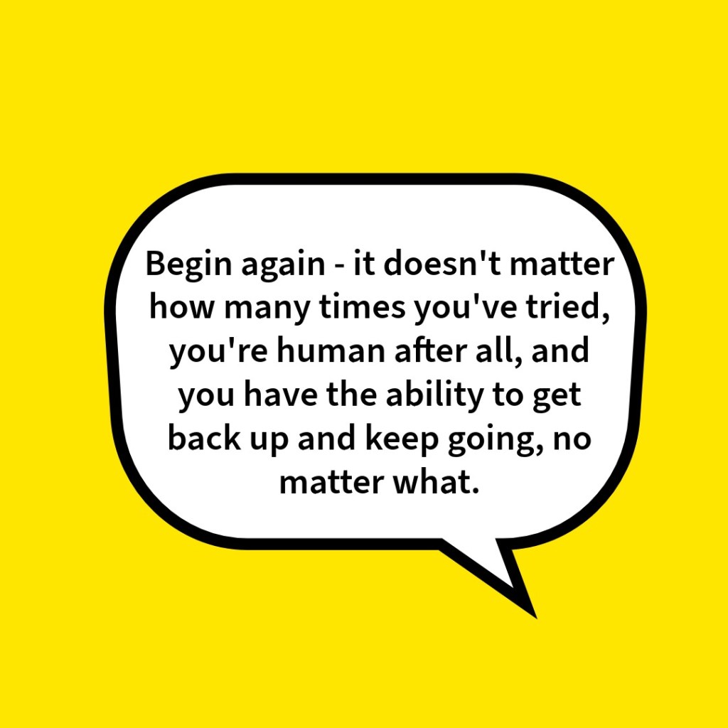 Begin again – it doesn’t matter how many times you’ve tried, you’re human after all, and you have the ability to get back up and keep going, no matter what.